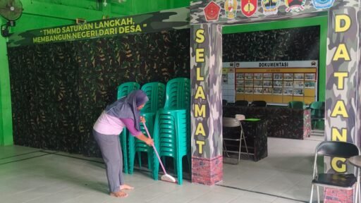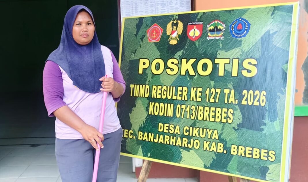 BREBES | Di halaman Pos Komando Taktis (Poskotis) TMMD Reguler ke-127 Kodim 0713/Brebes yang terletak di Desa Cikuya, Kabupaten Brebes, sorot matahari pagi Sabtu (21/02/2026) menerangi sosok seorang perempuan yang sedang giat menyapu setiap sudut area. Tangan tangannya yang terbiasa bekerja tidak pernah berhenti bergerak—membersihkan rerumputan yang tumbuh di tepi jalan, merapikan bangku-bangku plastik, dan mengepel lantai ruangan kerja para prajurit TNI. Ia adalah Ibu Antem (41 tahun), seorang pekerja kebersihan di Kantor Desa Cikuya yang dengan sukarela menjaga kebersihan posko tersebut.